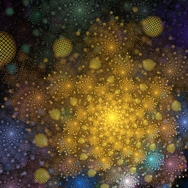 This image is a multicolored, joyful fractal. Fractal art uses mathematical formulas that iterate (repeat), so they can go on to infinity. Spirals... more